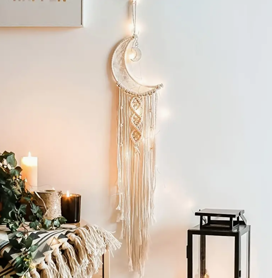 This Macrame Woven Crescent Moon Dream Catcher with lights is an enchanting piece that will illuminate your space with boho charm and serene energy. (lights included)
